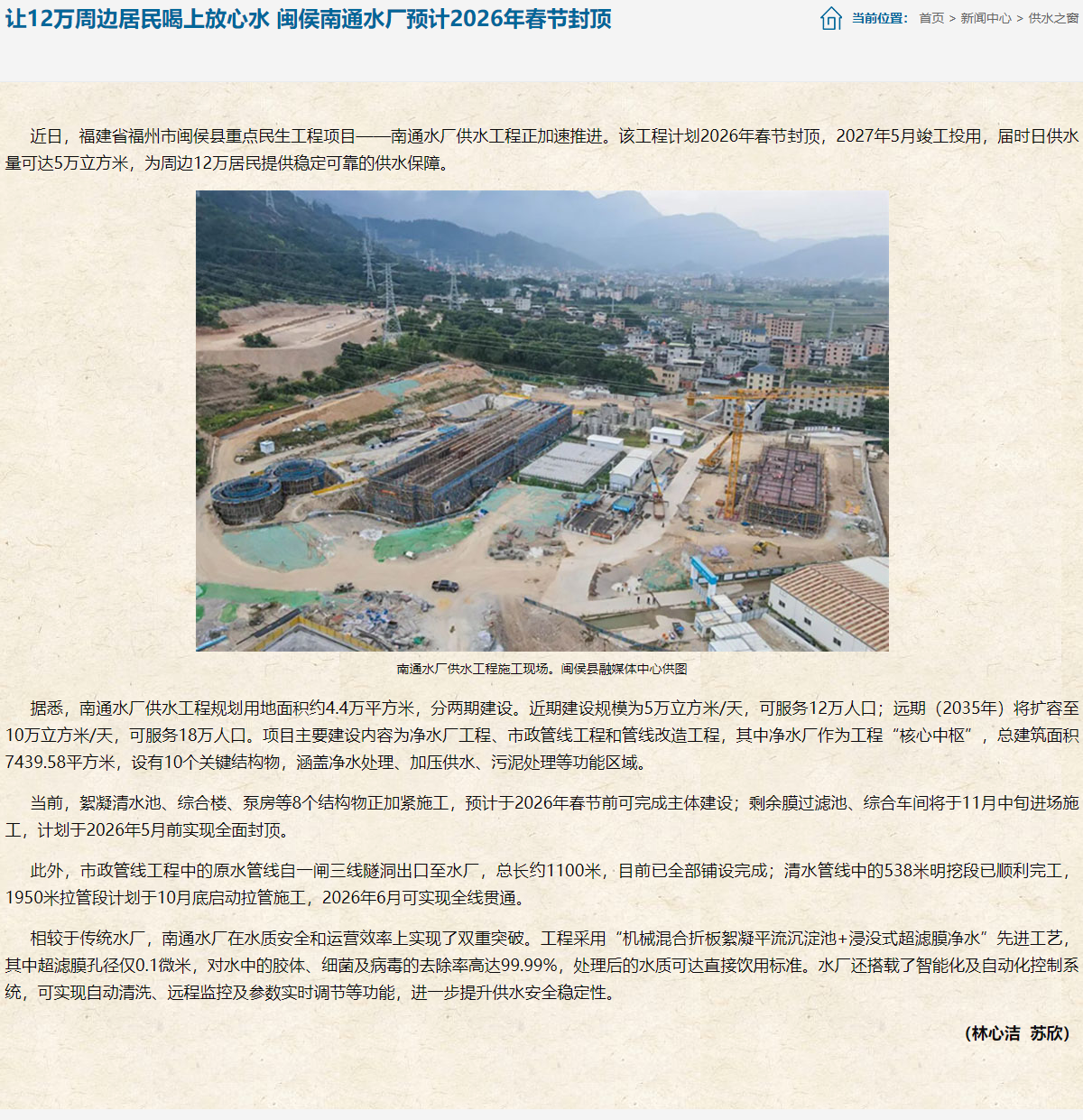 讓12萬周邊居民喝上放心水 閩侯南通水廠預計2026年春節(jié)封頂