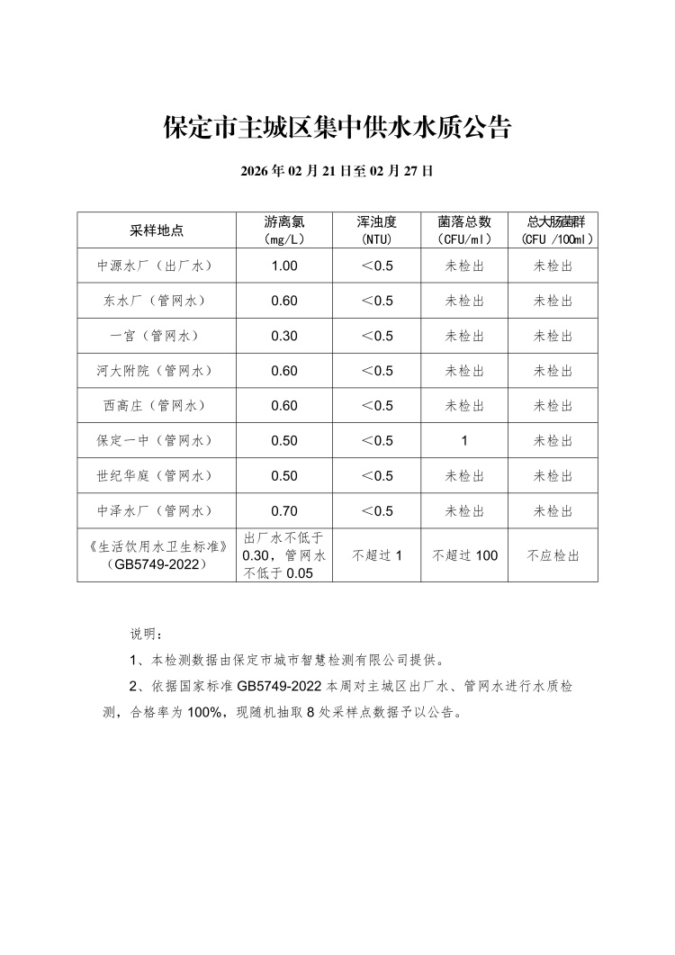 主城區(qū)集中供水水質(zhì)公告(02月21日至02月27日)