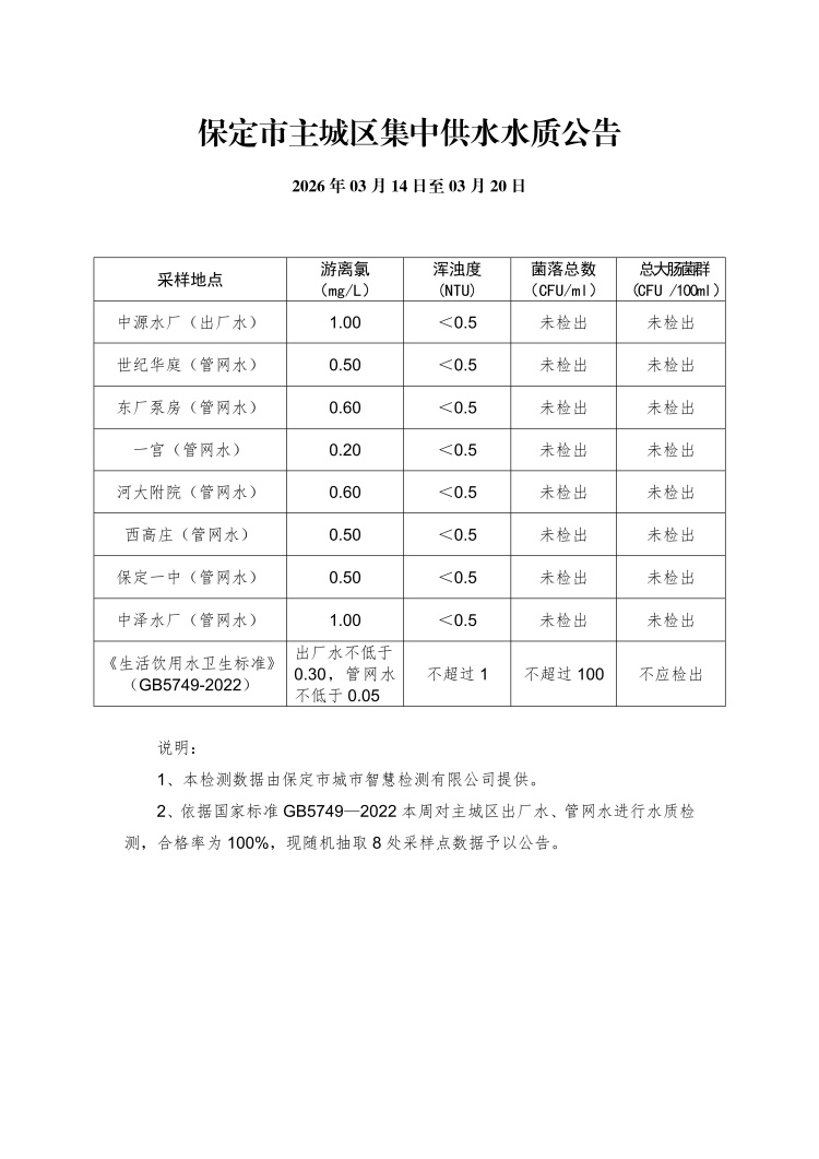 主城區(qū)集中供水水質(zhì)公告(03月14日至03月20日)